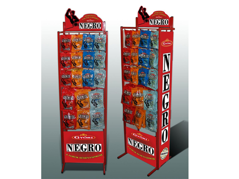 Több sorban felakasztható termékek bemutatására szolgáló display. Sok kommunikációs felülettel, melyek cserélhetőek, megújíthatók. Szétszedhető, jól mozgatható, tartós fém display megoldás üzletekben.